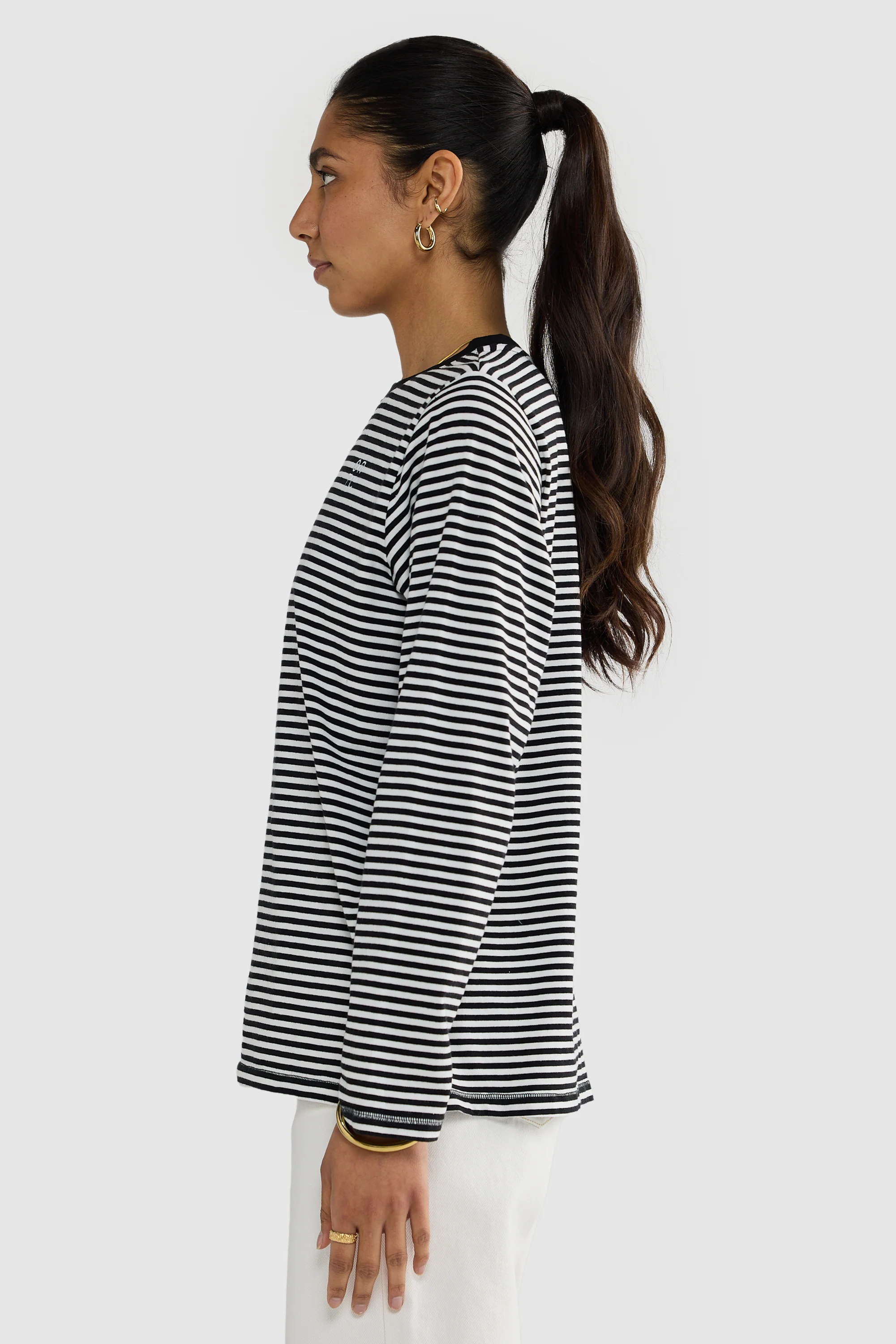 The Darla Long Sleeve T-Shirt is a refined everyday essential designed for ultimate comfort and versatility. Crafted from soft, breathable cotton, it features a relaxed silhouette that drapes effortlessly on the body. The classic stripe design is elevated with a contrasting neckline and a clean, white embroidered ORTC stacked logo at the chest for a subtle touch of branding. The Darla Long Sleeve pairs seamlessly with denim for easy, off-duty styling.
