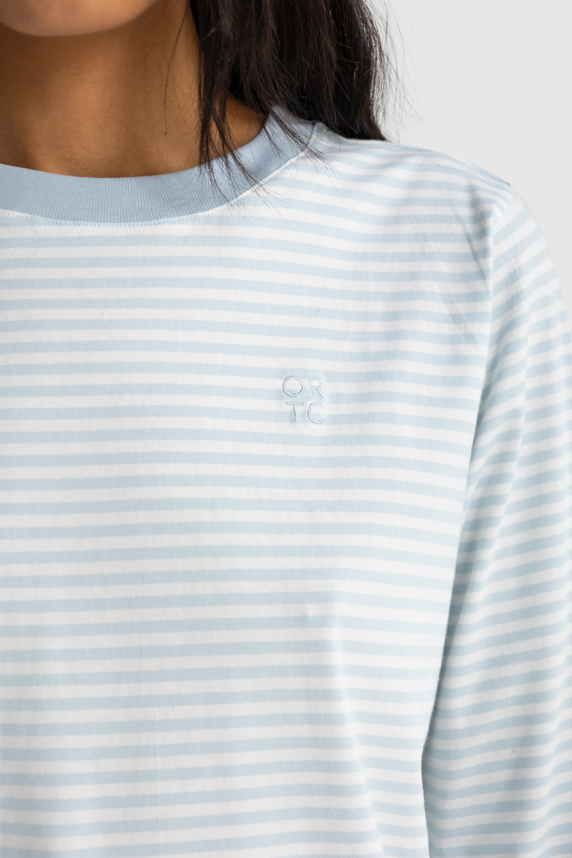 The Darla Long Sleeve T-Shirt is a refined everyday essential designed for ultimate comfort and versatility. Crafted from soft, breathable cotton, it features a relaxed silhouette that drapes effortlessly on the body. The classic stripe design is elevated with a contrasting neckline and a clean, white embroidered ORTC stacked logo at the chest for a subtle touch of branding. The Darla Long Sleeve pairs seamlessly with denim for easy, off-duty styling.