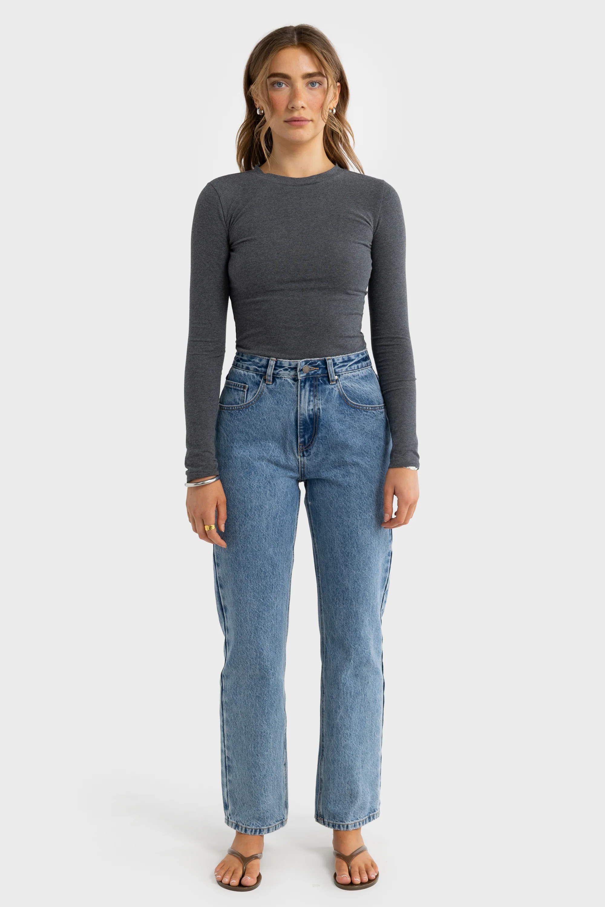 Evie Long Sleeve Fitted Top Charcoal Marle