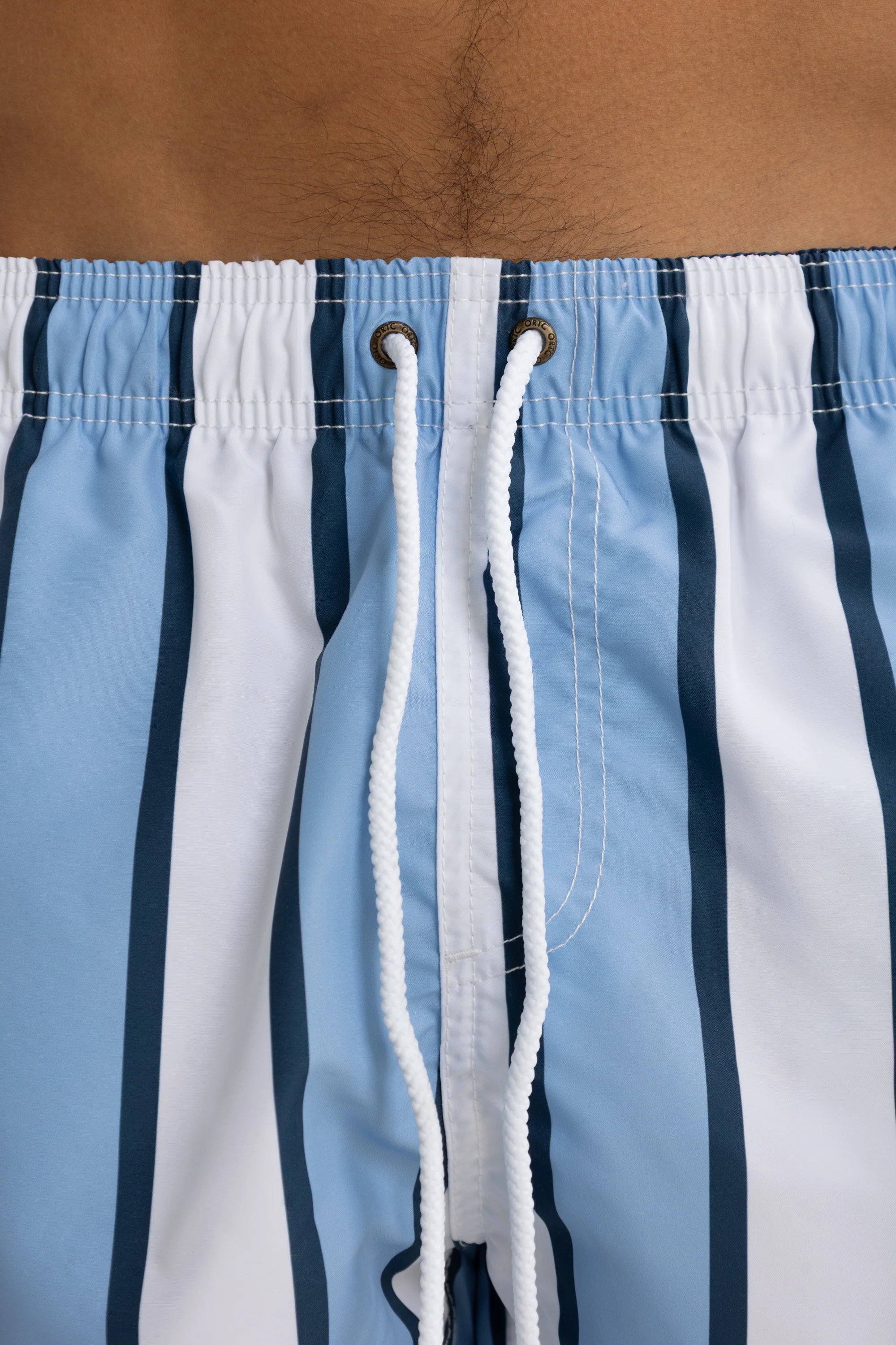 The Hamelin Stripe Swim Shorts Blue are the perfect addition to your summer wardrobe. Made from 100% Recycled Polyester, these mid-length shorts are quick-drying and lightweight. The elastic waistband with drawstring provides an adjustable fit, while internal fine mesh briefs provide extra comfort. Pair with one of our Linen shirts for the perfect summer look.