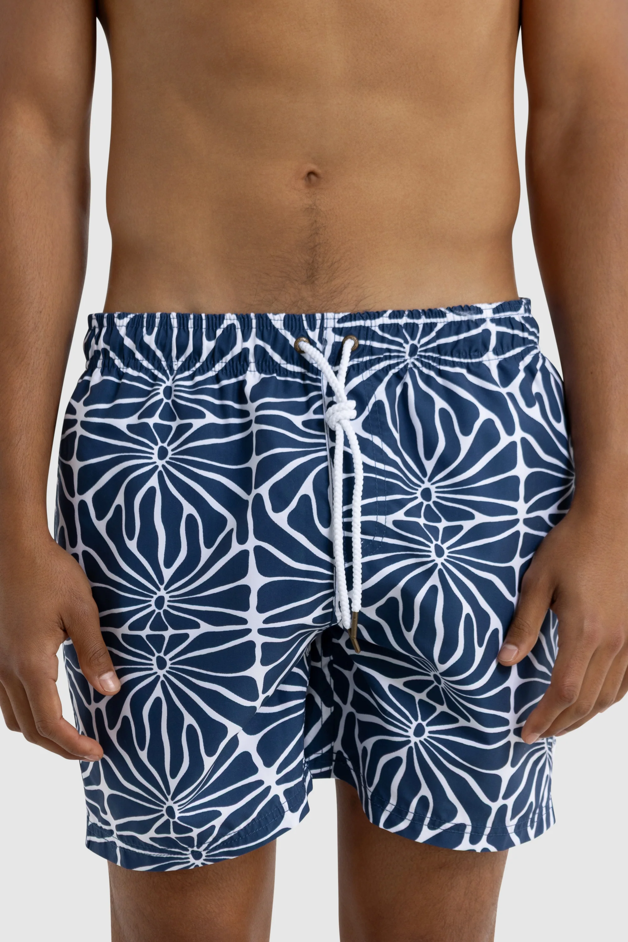 The Shelly Tropic Navy Swim Shorts are the perfect addition to your summer wardrobe. Made from 100% Recycled Polyester, these mid-length shorts are quick-drying and lightweight. The elastic waistband with drawstring provides an adjustable fit, while internal fine mesh briefs provide extra comfort.Â