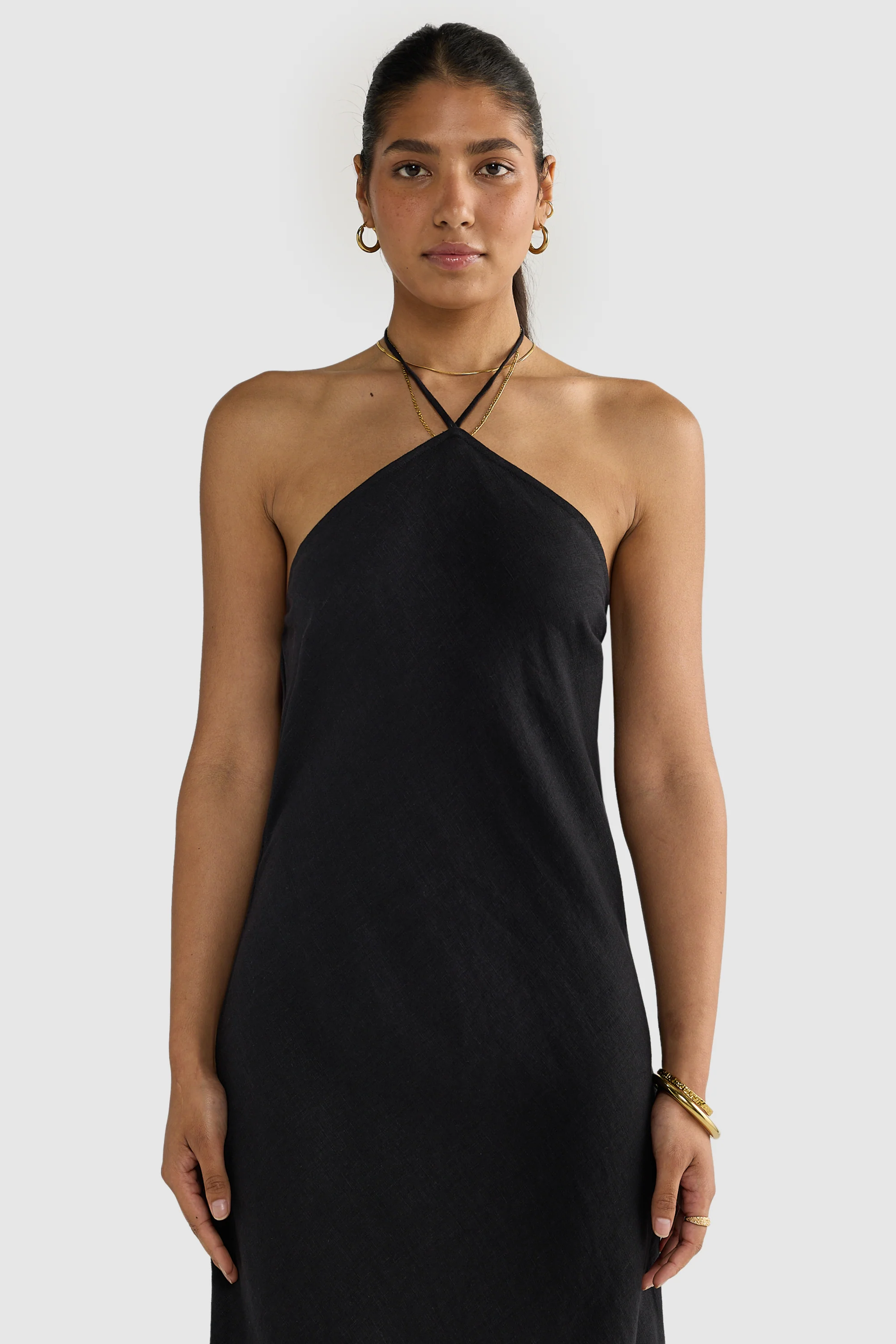 The Zia Linen Bias Cut Dress offers timeless elegance with effortless ease. This halter-style maxi features a flattering bias cut that softly skims the body for a fluid, feminine silhouette. The adjustable neck ties allow for a custom fit, while the minimal back detail adds an understated allure. Perfect for warm days and balmy evenings alike.
