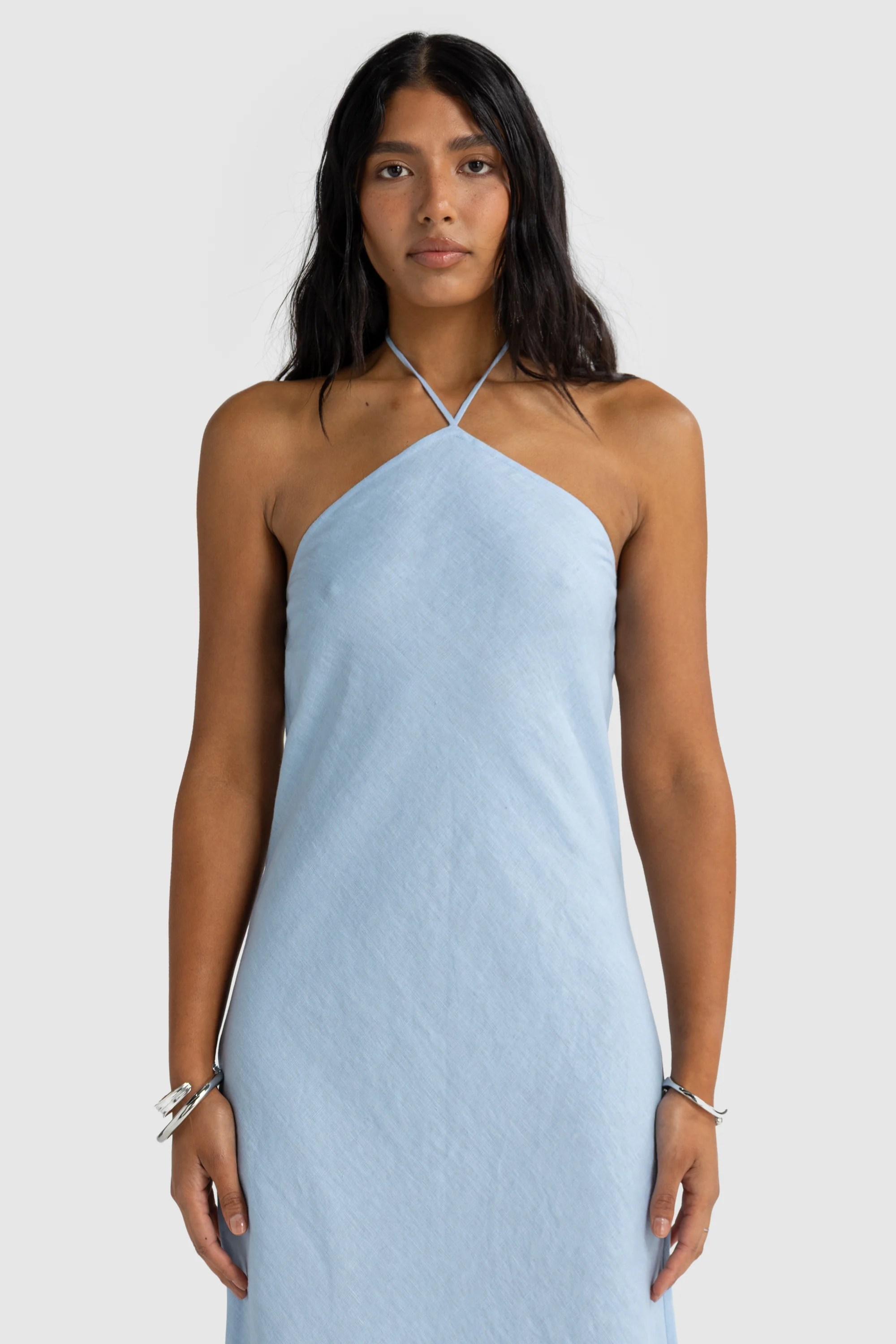 The Zia Linen Bias Cut Dress offers timeless elegance with effortless ease. This halter-style maxi features a flattering bias cut that softly skims the body for a fluid, feminine silhouette. The adjustable neck ties allow for a custom fit, while the minimal back detail adds an understated allure. Perfect for warm days and balmy evenings alike.